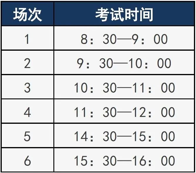 英语听说机考每天最多安排6场,每场考试时间约30分钟。考试安排如下: