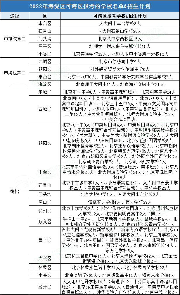 1、城六区是北京优质教育资源的集中地,在北京中考锁区的大环境下,为了向郊区教育薄弱地倾斜,北京城六区在招生计划中会向郊区进行跨区招生,通常跨区途径包括:市级统筹,校额到校等。