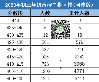 2023海淀区区排名最高分为440分,表中累计人数达到5414人。以上内容,属热心家长分享,仅供大家参考,若有错误,敬请指正。如果后续有更加完整版的排名,admw360中考网也将更新在此页面上。