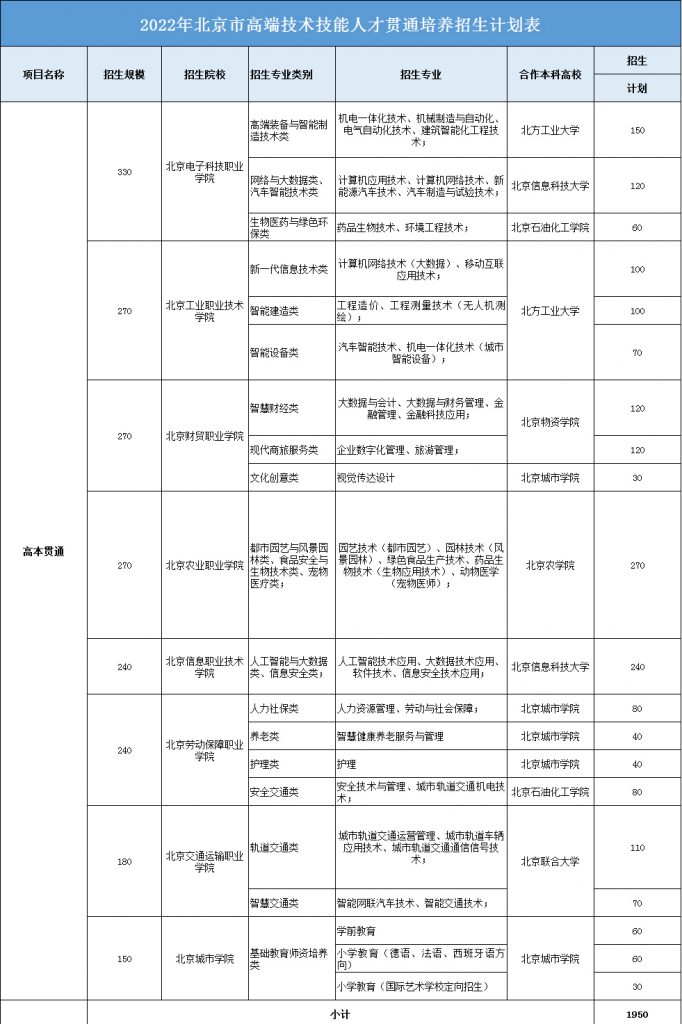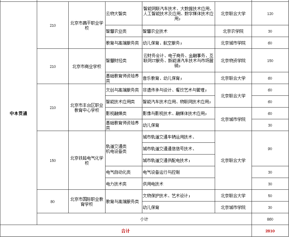 贯通培养的招生计划按照首都经济社会发展需要以及职业院校事业发展需求,由学校申报市教委统筹安排。招生计划、招生专业、上学地点、收费标准等详细信息依据2022年北京教育考试院发布的招生简章为准。
