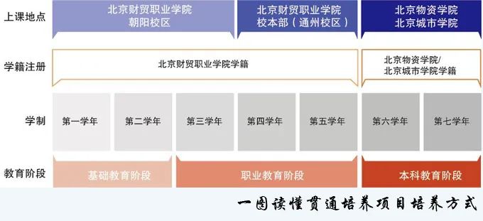 原则上由入选“北京市特色高水平职业院校”的中职学校与本科高校联合培养。前5年在中职学校学习,后2年在本科高校学习。高职阶段要强化本科高校的主体责任,学生管理、教学组织、评价考核由本科高校和中职学校协商合作开展。完成前3年学业且成绩合格者,由中职学校颁发中职毕业证书;完成前5年学业且成绩合格者,由合作本科高校颁发专科学历证书,完成全部学业且成绩合格者由合作本科高校颁发本科学历证书(专升本)。