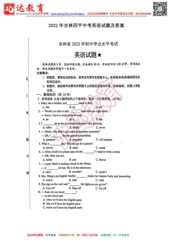 2022年吉林四平中考英语试题及答案