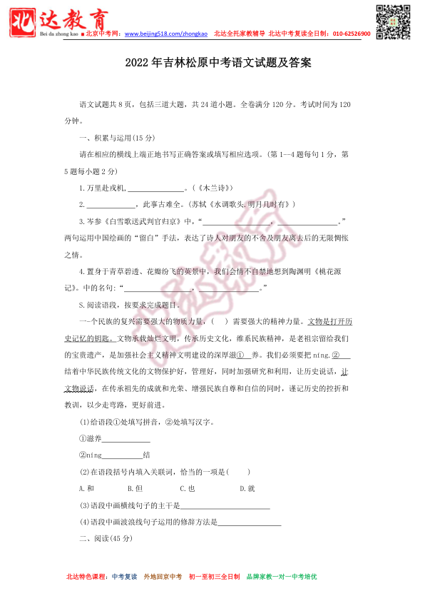 2022年吉林松原中考语文试题及答案