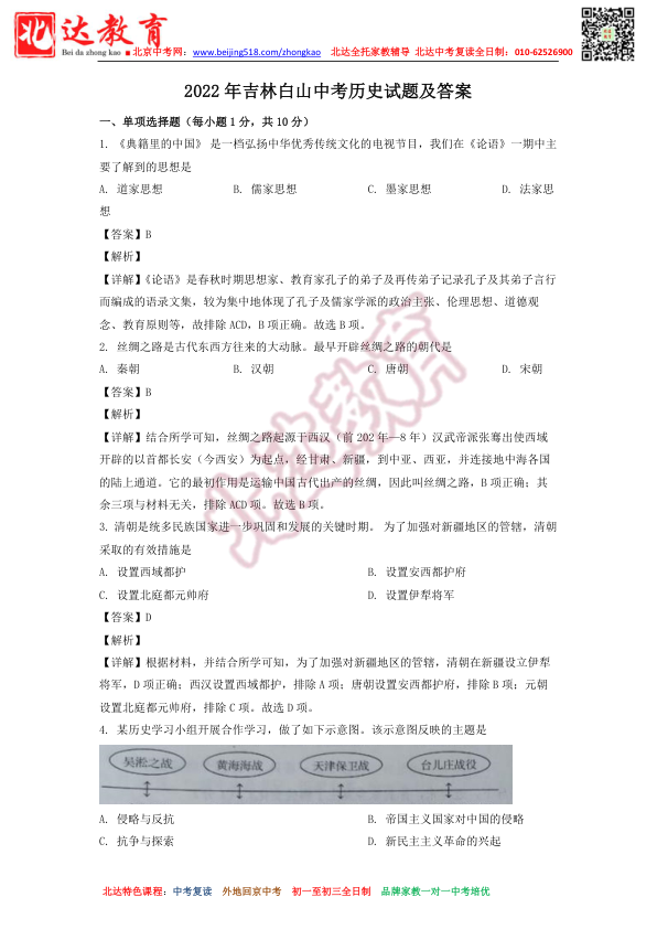 2022年吉林白山中考历史试题及答案