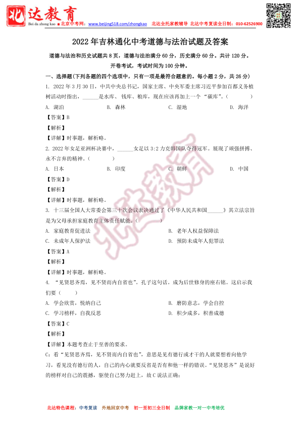 2022年吉林通化中考道德与法治试题及答案