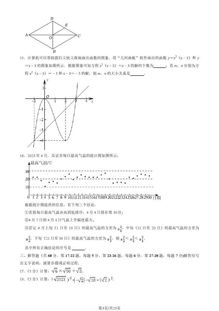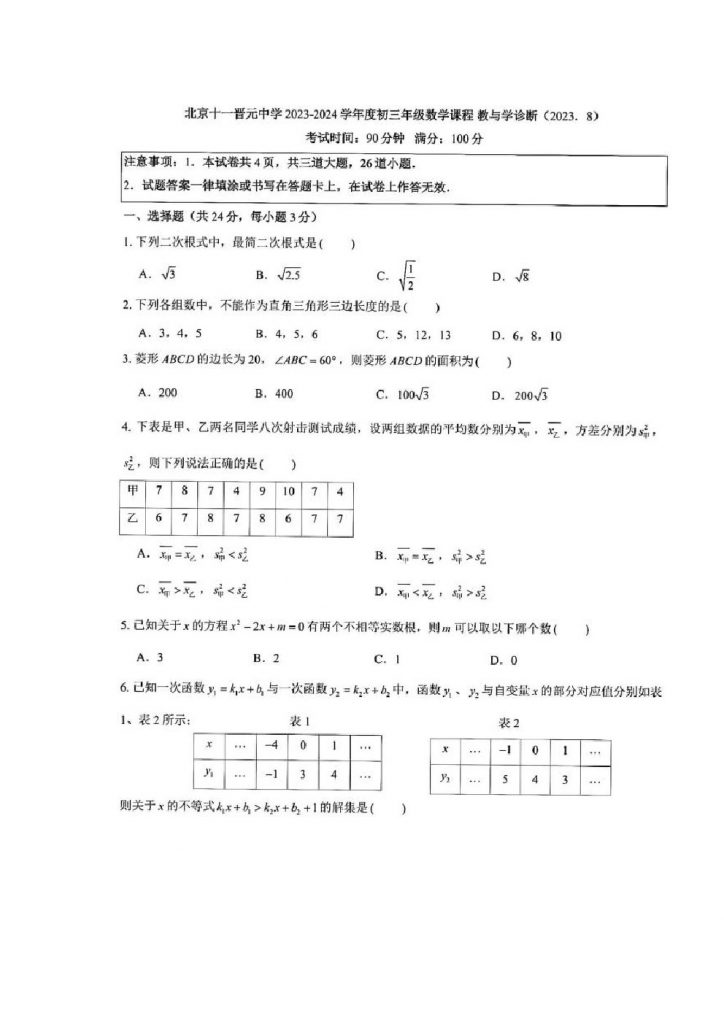 2024年北京初三即将开学,小编收集到了2023北师大实验中学初三上数学开学考试题及答案,现与大家分享。需要的自信下载练习吧。