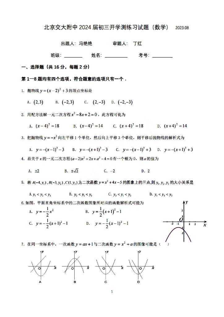2024年北京初三即将开学,小编收集到了2023北京交大附中初三上数学开学考试题,现与大家分享。需要的自信下载练习吧。