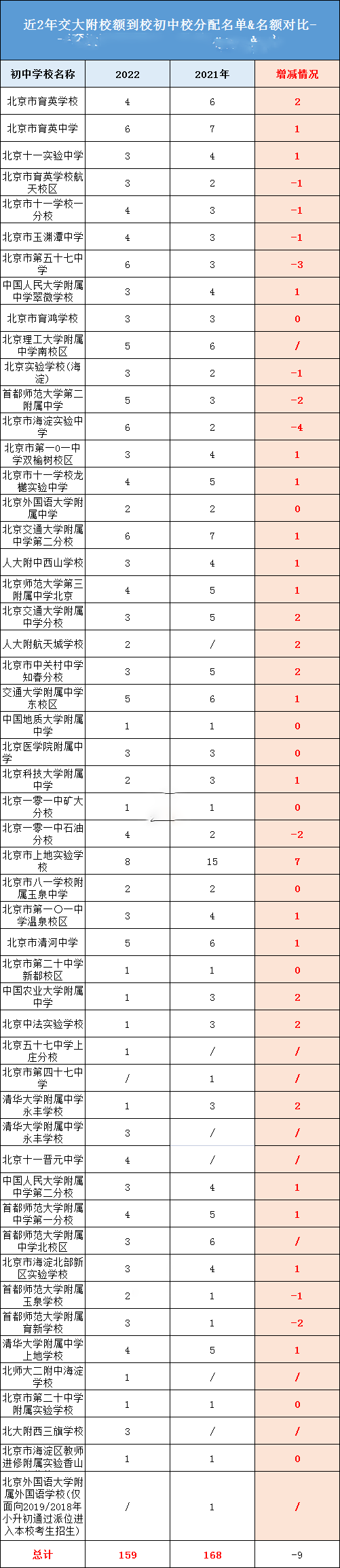 总的来说交大2022年比2021年校额到校名额减少了9个名额,所以想通过校额到校升入海淀进修附属实验的同学要注意自己所在初中校还有没有校额到校名额,详细分配名额对比见上图。
