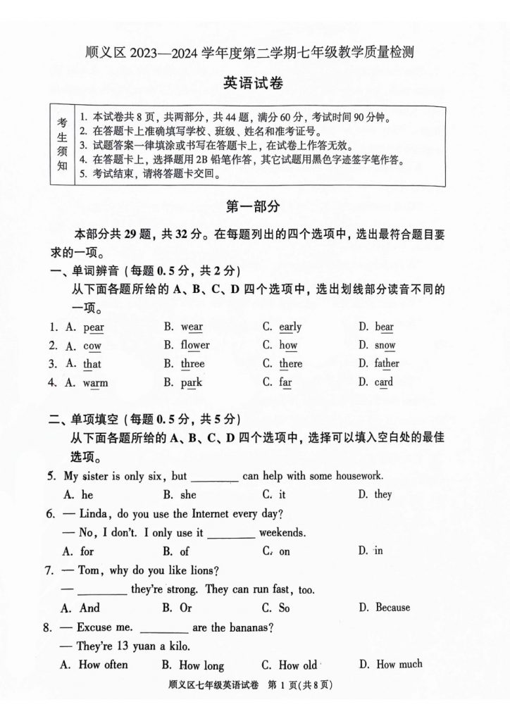 2024北京顺义区初一下期末考试已开始,小编为大家收集整理了相关科目的试卷,需要的同学可自行下载。
