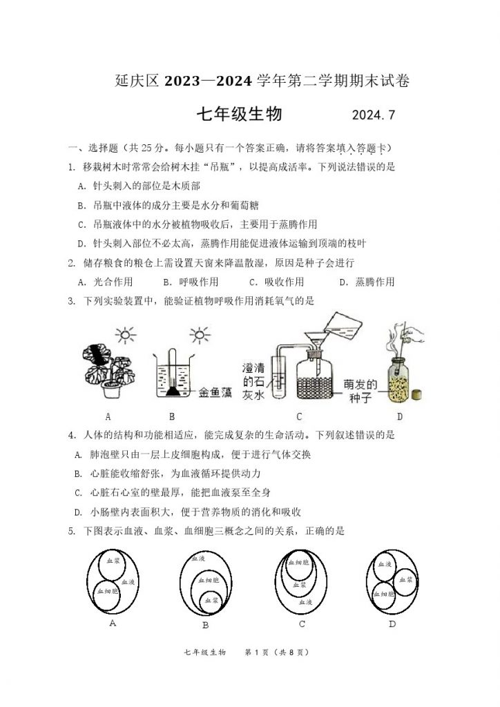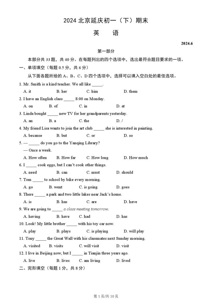2024北京延庆区初一下期末考试已开始,小编为大家收集整理了相关科目的试卷,需要的同学可自行下载。