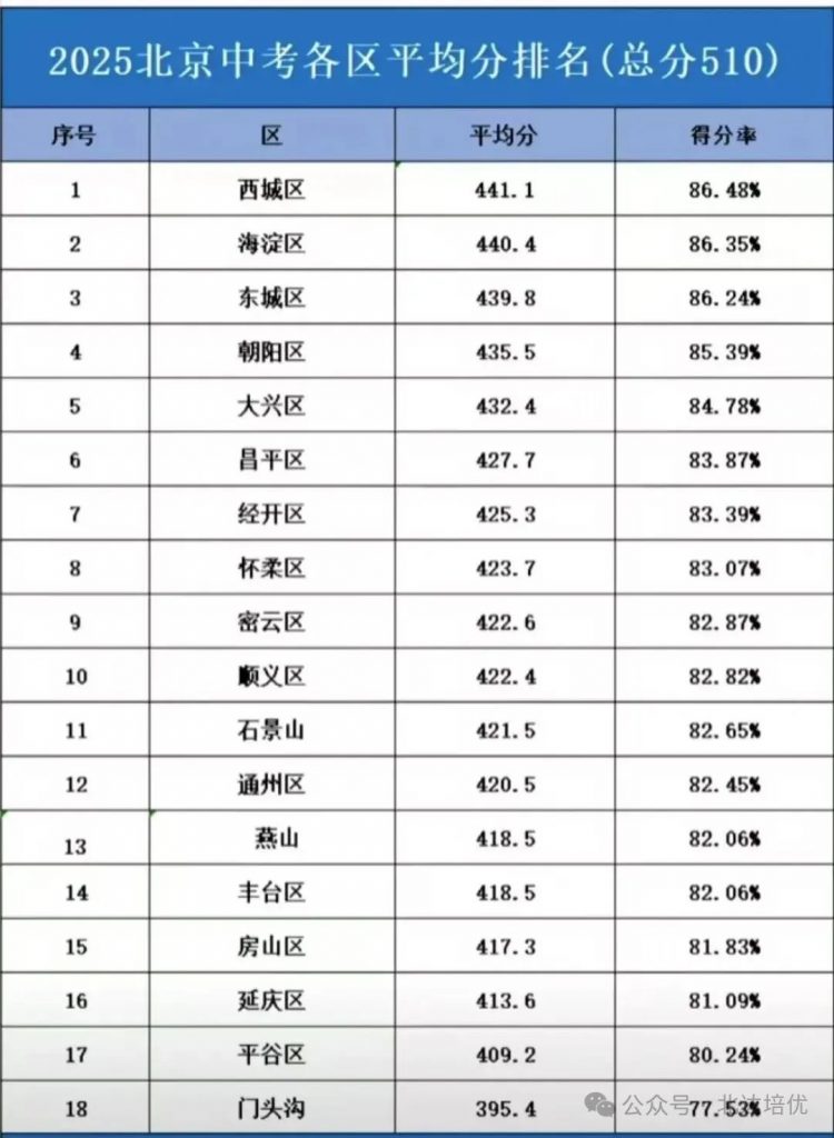 西城区中考平均分 441.1分,超越海淀位居第一,学生整体实力较强。