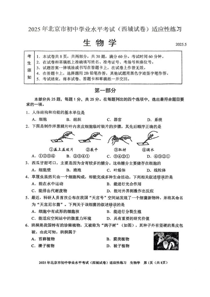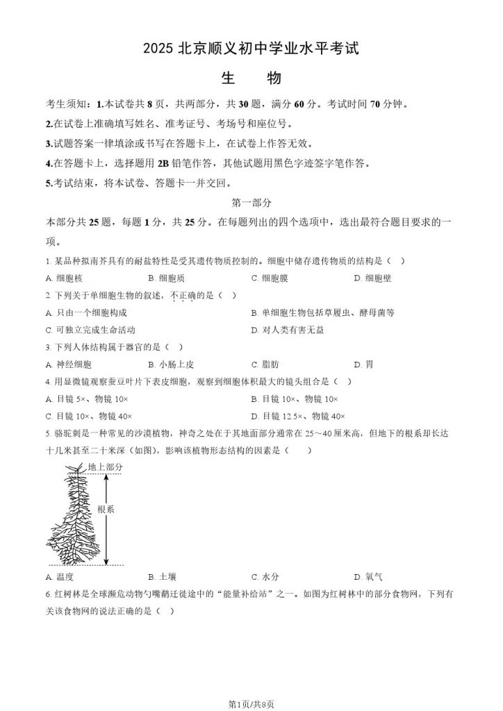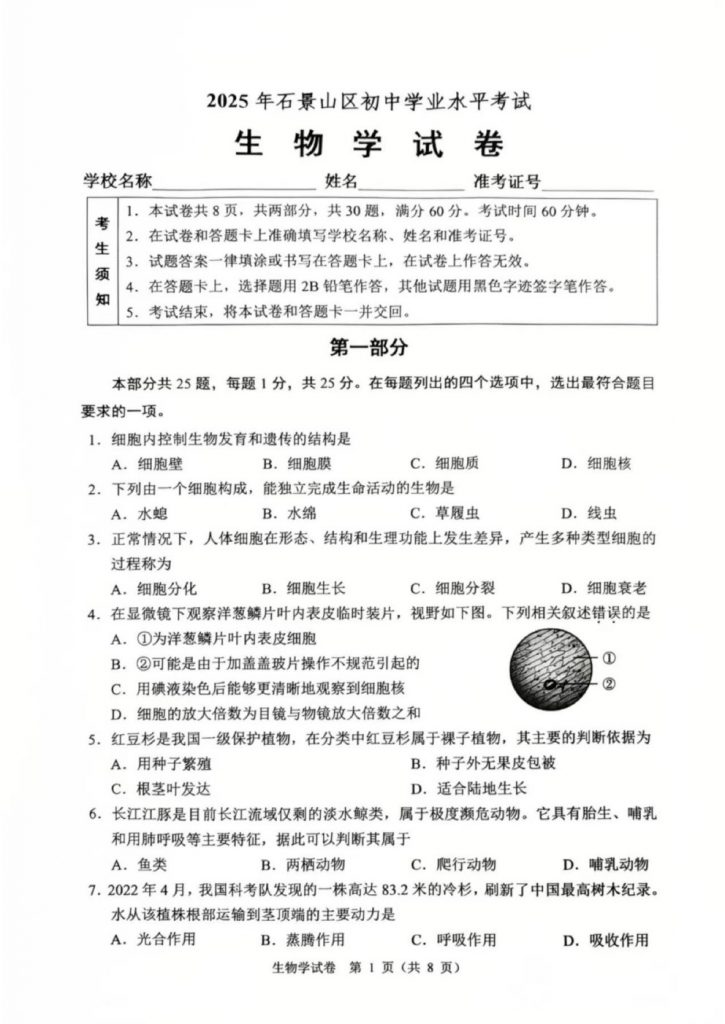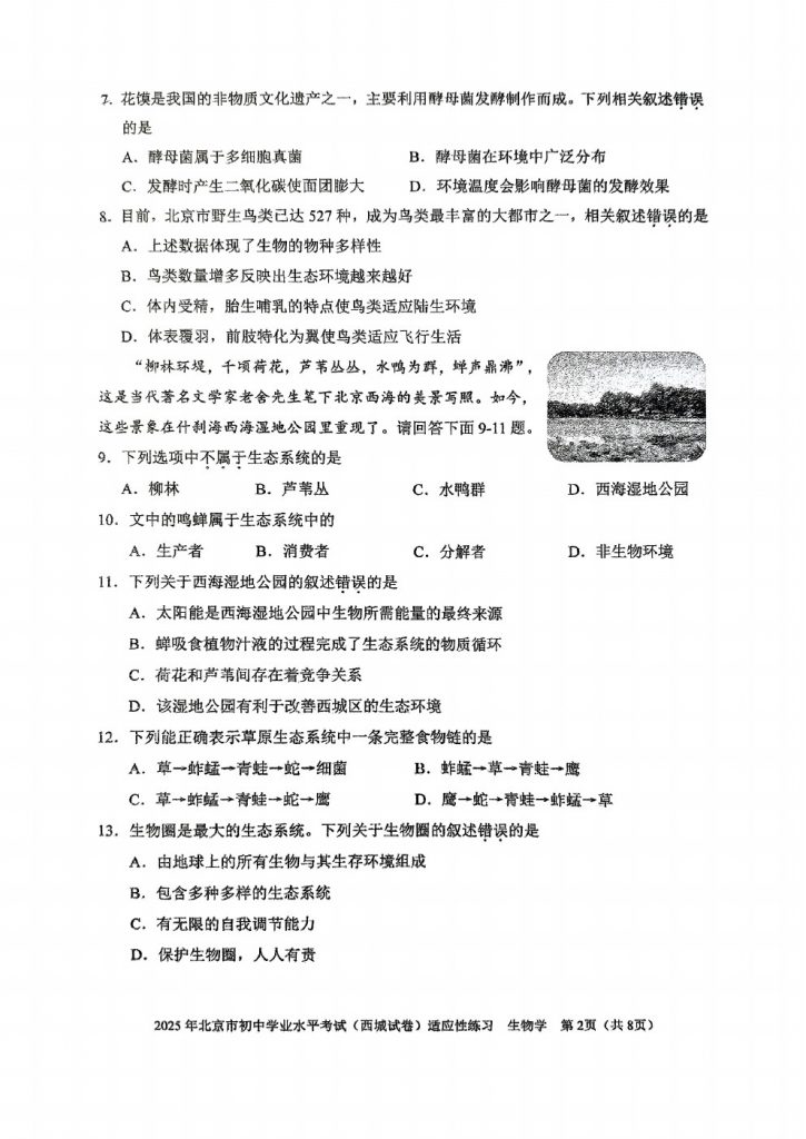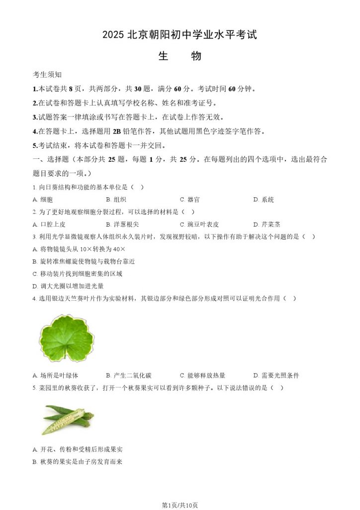 2025北京朝阳区初中学业水平考试生物试题及答案